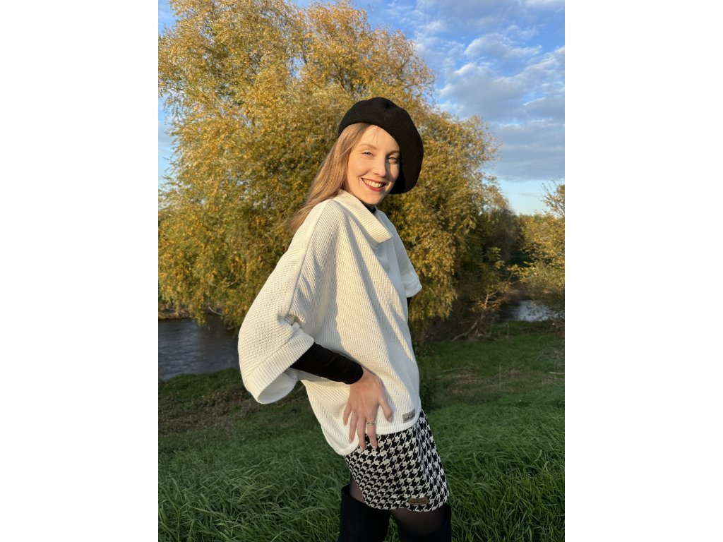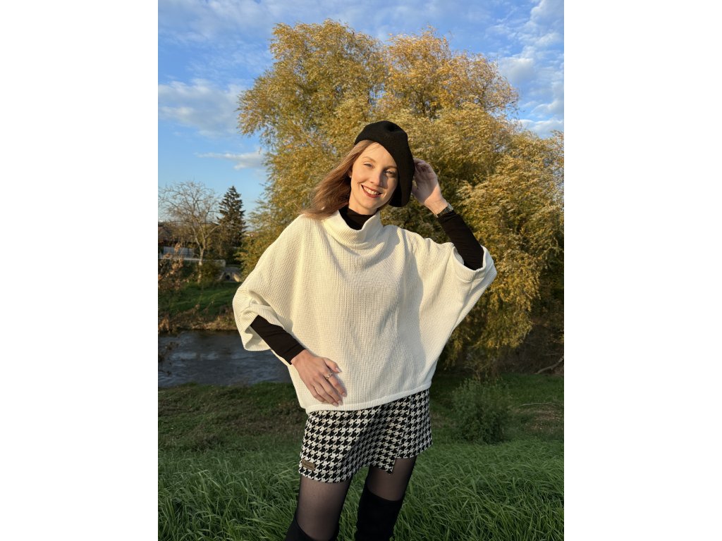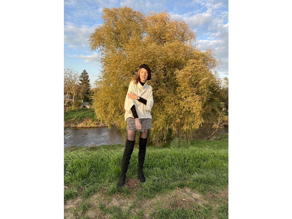 Hančo můžete vzít k mnoha příležitostem. Můžete ho vrstvit, můžete ho doplnit jednobarevnou košilí, roláčkem. Skvěle se hodí k sukni i ke kalhotám.